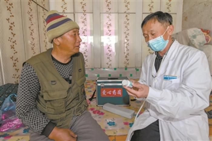 11月5日,在乾安县道字乡朝字村,村医杨帆(右)为贫困户讲解药品服用方法。2020年5月,吉林省松原市乾安县在148个有贫困户分布的村屯卫生室设立“爱心药房”,对贫困户普遍需求但在医保目录外的药品按照采购价50%给予报销。新华社记者 张楠 摄