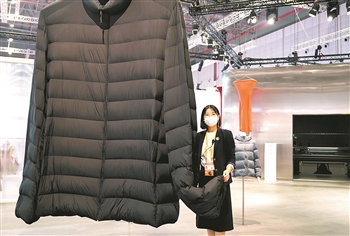 11月7日,第三届进博会消费品展区的优衣库展台工作人员展示一件巨型羽绒服。