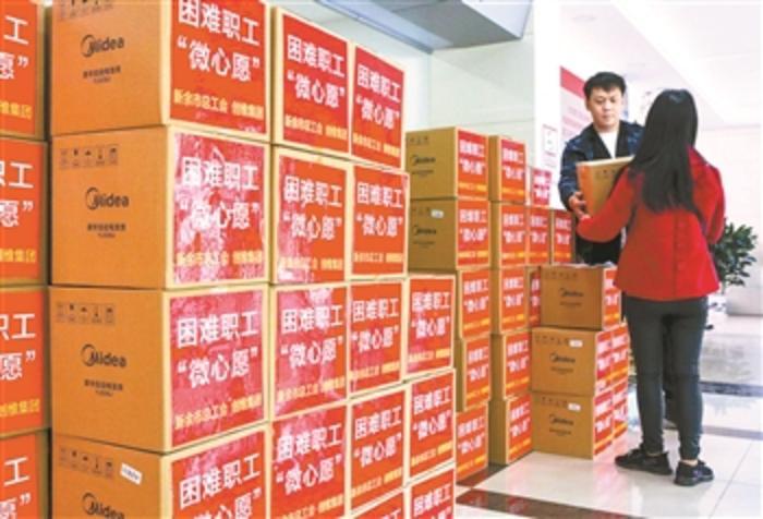 11月10日,江西省新余市总工会正在为困难职工发放“微心愿”物品。新余市总工会筹集资金13万元,为203名困难职工发放电视机、洗衣机、电饭煲、微波炉、电压力锅等物品,帮助他们实现“微心愿”。
