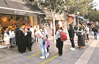 11月10日,在耶路撒冷,人们排队等待进入一家街头商店。耶路撒冷于8日起放松防疫限制措施,允许街头商店重新开业,但商店内人员数量有一定限制。