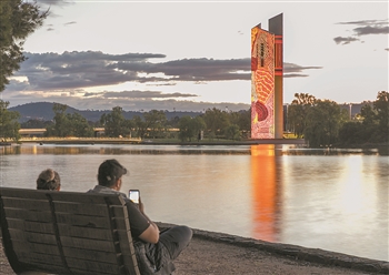 澳大利亚首都堪培拉11月8日至15日在国家钟楼举行原住民文化艺术展。图为11月10日,人们观看国家钟楼上的投影。 新华社发(刘畅畅 摄)
