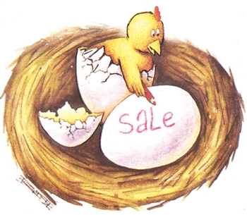 瞧,刚刚出壳的鸡雏叫卖蛋品啦!(外文为“出售”)小家伙是天生具有商人头脑?还是“崽卖爷田”的败家子?【乌克兰】瑞巴卡思
