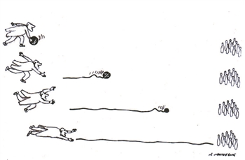 这位先生正用毛线球打保龄球。他发力适度,手法精准,运转如常,只是临至“门”前功亏一篑,线到尽头……