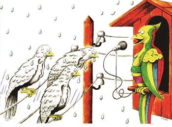 讲演者身在屋檐下喋喋不休地大谈“关爱”话题,面对被雨雪淋透羽毛瑟瑟发抖的下级却无动于衷……【塞尔维亚】巴比奇