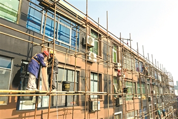 11月15日,工人在河南省焦作市温县一处老旧小区改造项目中施工。