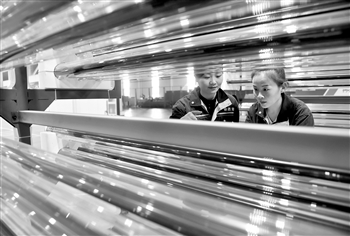 11月12日,河北省威县一家新能源企业工人在车间检查太阳能集热管产品质量。