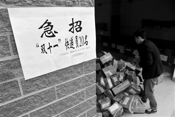 11月2日,浙江省临安市一家快递公司的门口粘贴着“双11”期间的招工启事。胡剑欢 摄/人民图片
