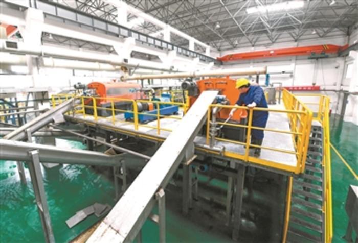 11月18日,工作人员在查看餐厨垃圾处理设备运行情况。