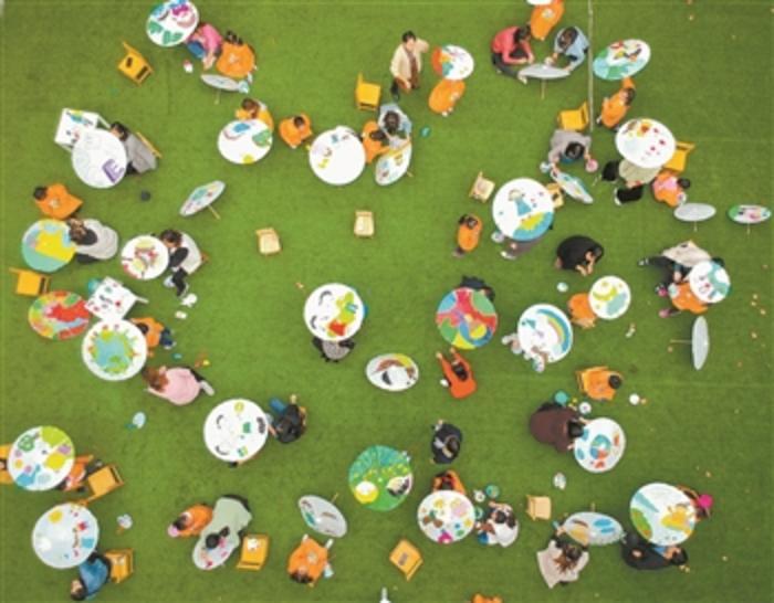 11月17日,在江苏省如皋市长江镇新港幼儿园,一场以“亲子同绘七彩未来”为主题的迎“世界儿童日”创意美术体验活动举行。参与活动的孩子和家长共同在纸伞上进行创意图画,尽情抒发自己对未来的美好展望,画出精彩、画出未来。徐慧 摄/视觉中国