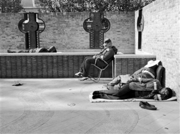 11月13日中午,在北京南二环一处街边公园里,几名完成清扫任务的环卫工人趁着午休时间,或席地而卧或倚墙而憩。他们大多凌晨就起身工作,在找不到合适的地方歇脚时便就地休息。本报记者 程莉莉 摄
