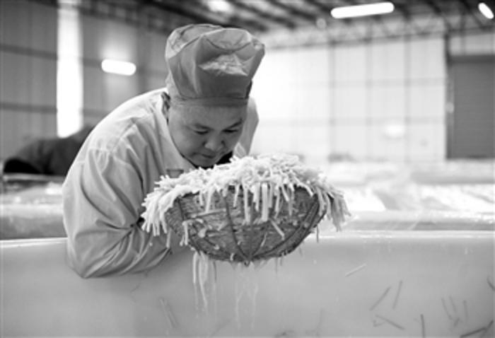 11月18日,李永国在酸笋腌制车间用鼻子识别酸笋发酵情况。今年41岁的李永国曾是广西百色的竹笋种植户。随着螺蛳粉热销,凭借“闻味识酸笋”的能力,他被柳州一家螺蛳粉工厂聘用,每天对60缸酸笋的色泽、成熟度进行鉴别和记录。