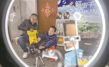 11月17日,河北巨鹿张王疃乡大留庄村,40岁的李成宝(图右)正坐在凳子上与县里的脱贫特派员高泉通过电商平台直播卖货。李成宝长期患有低磷性佝偻病,四肢骨骼严重变形,无法行走,只能靠着一只木板凳挪行,被好友和粉丝们亲切地称为“板凳哥”。