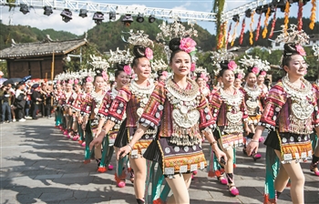 11月19日,身着盛装的苗族同胞参加巡游活动。