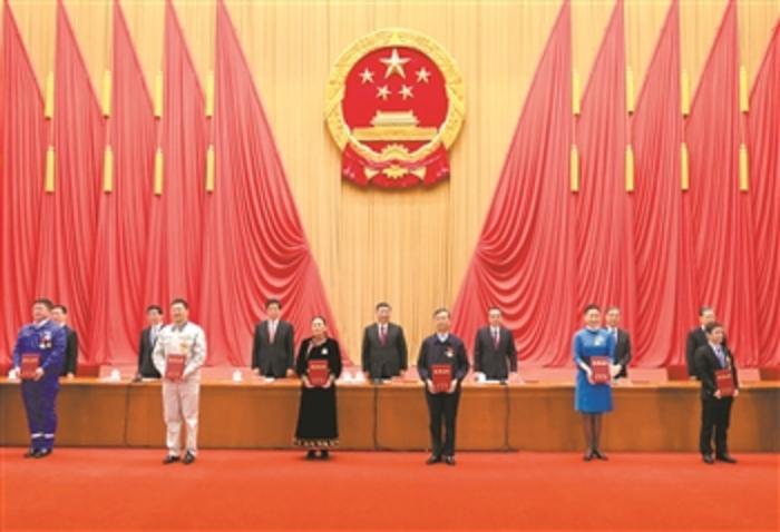 在欢快的乐曲声中,全国劳动模范和先进工作者代表依次登上主席台,习近平等为他们颁发荣誉证书。