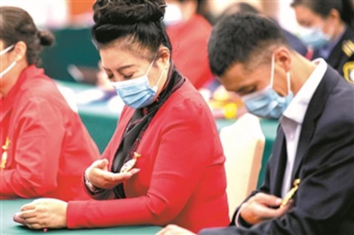 11月21日,北京,在一次沟通会上,两位拟接受表彰的全国劳动模范和先进工作者不约而同掂了掂胸前试戴的奖章。