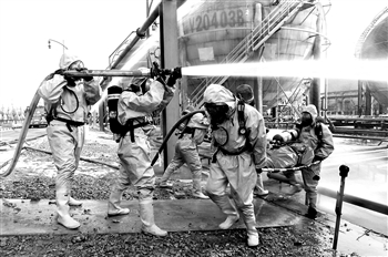 11月25日,消防员在发生“火情”的化工厂区域进行灭火救援演练。
