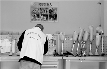 11月25日,负责实施免费安装的织金县恩荣爱康公司技工在加工假肢。