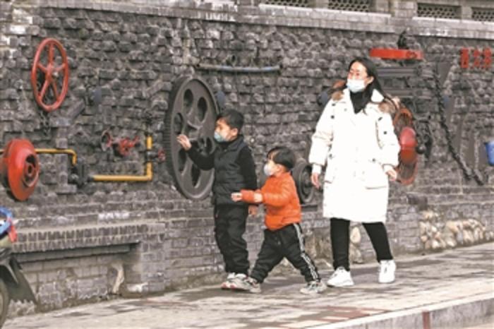 11月29日,在河南省焦作市中站区王封矿“西大井1919”特色商业街,游客欣赏由废旧煤矿设备改造成的文创作品。