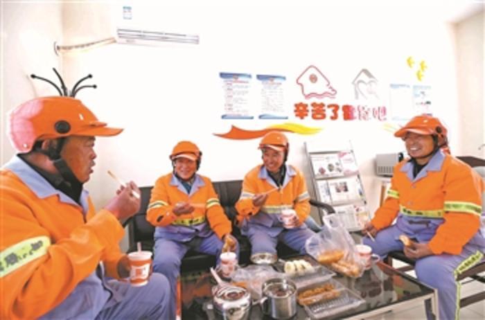 11月29日,山东省东营市东营区黄河路环卫工人休息室内暖意融融,几位环卫工人在这里热饭、喝水和短暂休憩。休息室配有空调、微波炉、饮水机、桌椅、茶几、电视、医药箱、雨具、报刊架等各种常用设施。目前,该区环卫工人休息室已有30余个。周广学 摄/人民图片