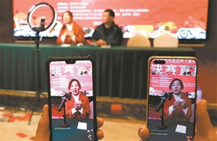 11月26日,安徽省合肥市肥东县电商技能大赛决赛现场,参赛选手正在直播卖货。本次大赛共吸引了全县18个乡镇2个园区的44支队伍104人报名参赛,最终20支代表队进入决赛。许庆勇 摄/中新社