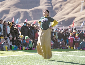 当日,为期三天的西藏山南市扎囊县首届农民运动会在扎囊县体育公园进行。抱石头、套麻袋、氆氇缠线等多项趣味十足的运动,吸引了来自扎囊县5个乡(镇)、62个行政村(居)的450多名农牧民运动员参加角逐。每年冬季,雅鲁藏布江流域的西藏农村进入农闲时期,当地农牧民就迎来了一年中难得的休闲时光。新华社记者 普布扎西 摄