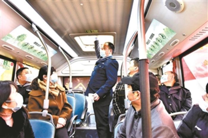 12月3日,夏力为社区居民讲解公交车上逃生窗的使用方法。