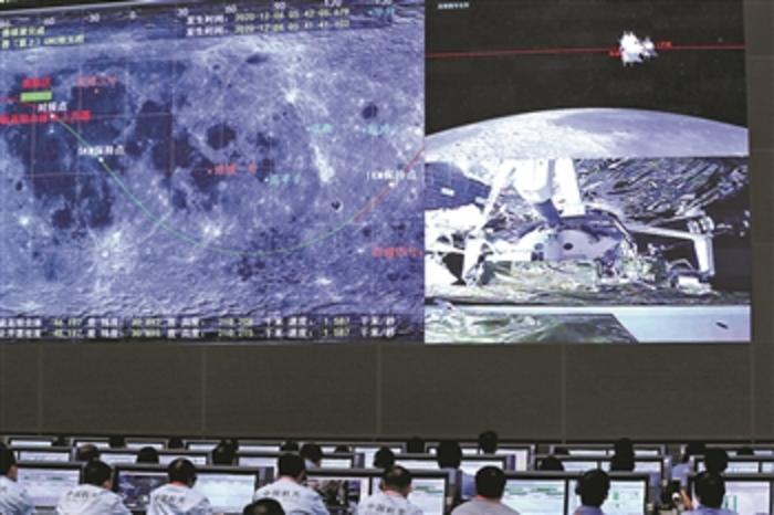 12月6日,航天科技人员在北京航天飞行控制中心指挥大厅监测嫦娥五号上升器与轨道器返回器组合体交会对接情况。