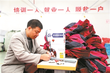 贵州省遵义市余庆县易地扶贫搬迁户、聋哑残疾人陈彬在扶贫工厂车间作业(12月4日摄)。
