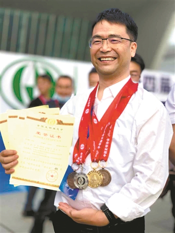 甘肃省总工会近年来持续开展灵活多样、各具特色的群众性经济技术创新活动,不断把每一位岗位职工的想象能力、实践能力和创造能力转化成为技术成果,推动企业技术进步和高质量发展。图为在第二十四届全国发明展览会——“一带一路”暨金砖国家技能发展与技术创新大赛上,一名甘肃职工展示自己的获奖证书。