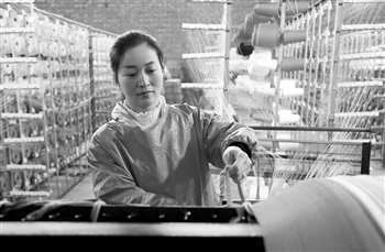 近日,一名留守妇女在河北省邢台市南和区和阳镇东关村一家老粗布加工厂工作。近年来,当地拓宽留守妇女就业创业渠道,依托龙头公司带动,通过手工艺培训,扶持以家庭为生产单位的特色手工业,让留守妇女在家门口实现就业增收。 新华社发(张驰 摄)
