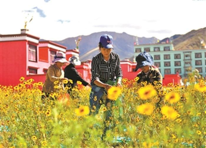 西藏拉萨市四季吉祥村村民在采摘雪菊(2017年9月27日摄)。