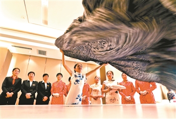 12月5日,甘肃张掖旅游服务行业技能大赛上,参赛选手正在进行餐桌桌布整理比赛。当日,100多名选手参加导游讲解员、客房服务员、餐饮服务员3个职业赛事的激烈角逐。冬春季旅游季到来,张掖开展岗位练兵、技能竟赛、职业培训,提升了旅游从业人员素质。 王将 摄/人民图片