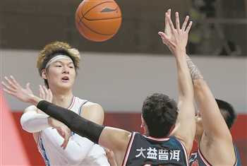 12月7日,福建豹发力队球员王哲林(左)在比赛中传球。当日,在浙江诸暨举行的2020-2021赛季中国男子篮球职业联赛(CBA)第二阶段第15轮比赛中,广东东莞大益队以153比145战胜福建豹发力队。