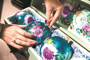 若斯托沃彩画工艺的历史可以追溯到19世纪初期,当时,莫斯科郊区的一些城镇和村庄出现了生产涂漆制品的作坊,产品包括托盘、烟盒、茶壶等。若斯托沃彩画的图案主要有花卉水果,生活图景,神话故事及文学作品的情节等,画工精细,生动逼真。绘制着若斯托沃彩画的工艺品除了具有实用价值,还常常作为俄罗斯家庭的新年装饰品,同时也是热门的礼品和旅游纪念品。 新华社发 (马克西姆 摄)