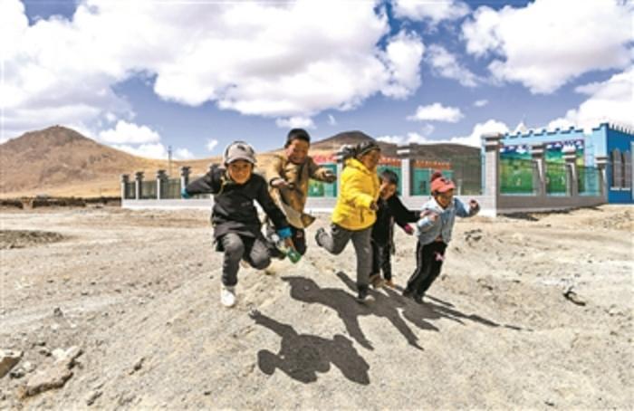 普玛江塘乡小朋友在新建成的幼儿园前玩耍(4月16日摄)。