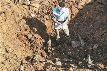 近日,中国第19批赴黎巴嫩维和部队多功能工兵分队在黎巴嫩南部纳古拉地区成功实施一批过期弹药的销毁作业。这批弹药主要包括信号弹、烟雾弹和含弹头的自推式火箭发射器。图为12月4日,维和部队排爆战士为弹药销毁做准备。 新华社发(丁文栋 摄)