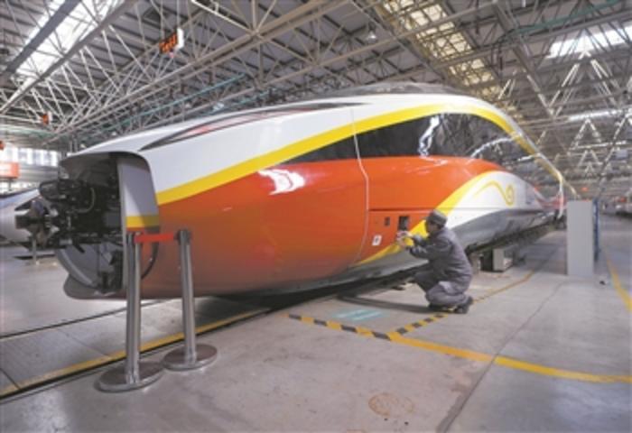 近日,中车唐山公司员工对列车进行检测。日前,我国时速400公里跨国互联互通高速动车组在位于河北省唐山市丰润区的中车唐山公司下线。