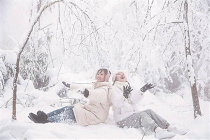 12月12日,两位游客在峨眉山冰雪中嬉戏。