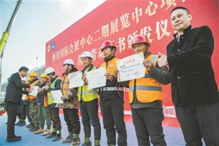 12月11日,西安国际会展中心二期展览中心项目主体封顶暨首批《劳动证书》发放仪式在中建八局西北公司项目工地举行,2000名参加该项目建设的劳动者获得以示纪念的《劳动证书》。据悉,这是陕西省建设工会首次对在陕工程项目参加的建设者颁发《劳动证书》。