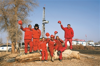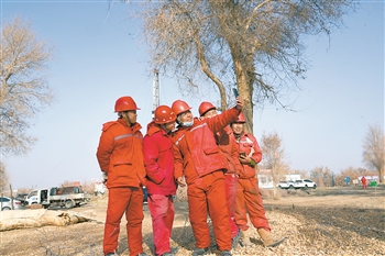 图为12月1日中午,西北油田采油三厂TP204井作业现场,工人们午间小憩时,以胡杨、井场为背景合影。