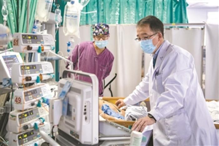 北京援藏医生王小亭(右)在西藏自治区人民医院病房为病人做重症超声评估。