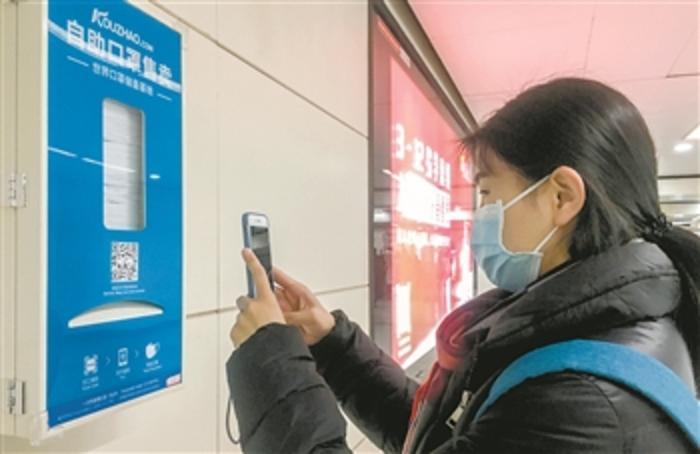 北京地铁10号线成寿寺站进站口,一名乘客正在新配置的口罩售卖机前扫码购买。近日,北京地铁为满足乘客防护需求,已经在部分地铁站设置了口罩售卖机,下一步将实现全线路覆盖。本报记者 王伟伟 摄