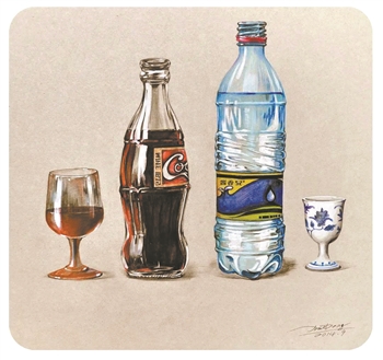 《私人订制》,仅凭这几个字,就能引起人们足够的好奇,再看作品的构图、造型、用色以及光感,绝对称得上有滋有味。接下来,我们就忍不住要探究细节了。看矿泉水瓶上的“酱香52°”,1872年的可乐,令人哑然失笑;再看看两侧考究的酒具,就笑不出来,甚至可能会生一肚子气。