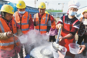 12月20日,安徽阜阳,建筑工人们在中建五局阜阳肿瘤医院项目工地生活区一起品尝煮熟的饺子。冬至即将到来之际,项目开展“冬至饺子香、情暖工友心”活动,让建筑工人免费吃上一份热腾腾、香喷喷的饺子。 王彪 摄/视觉中国