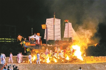 11月16日凌晨,在马来西亚马六甲,“国安号”王船被焚化。新华社发(沈德源 摄)