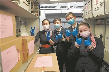 配图为2月17日,东航“共青团号”航班护送援鄂医疗队前往武汉,乘务组将物资赠送给医疗队。吴骁周 摄