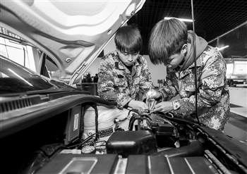 近年来,贵州省铜仁市玉屏侗族自治县依托职业学校教学资源,针对农村剩余劳动力,采取“政府买单、企业订单、学校列单”的职业技能培训方式,开设餐饮服务、汽车修理、数控技术与应用、服装设计等专业的技能课程,“授人以渔”助力就业。图为该校学生进行汽车维修实操。 新华社发 胡攀学 摄