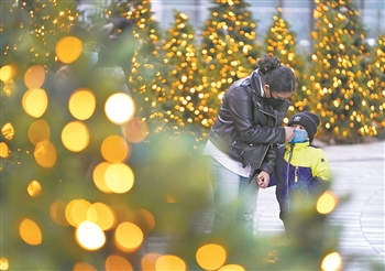 12月22日,在美国纽约,一名女子为孩子整理口罩。随着圣诞节和新年临近,纽约节日气氛渐浓,但美国新冠疫情加速蔓延给这个圣诞季蒙上了一层阴影。