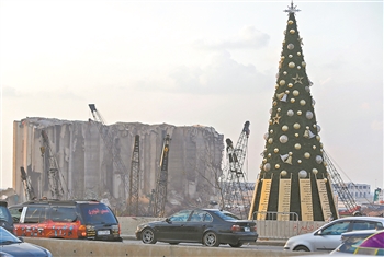 12月22日,黎巴嫩贝鲁特港口爆炸废墟附近一棵圣诞树上面挂着爆炸中死难者的名字。贝鲁特港口区8月4日发生剧烈爆炸,造成至少190人死亡、6500多人受伤。