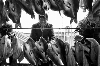 12月23日,浙江省湖州市南浔区菱湖镇渔民在晒场晾晒鱼干。冬季里,菱湖镇渔民忙着晾晒鱼干,准备供应年货市场。